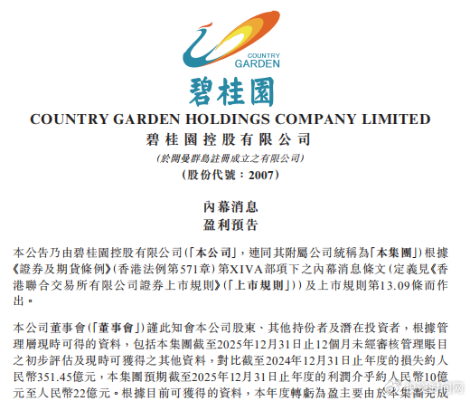 碧桂园发布盈利预报