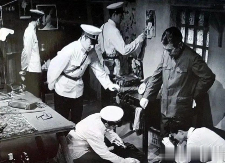 刑侦老电影中民警勘测现场的剧照