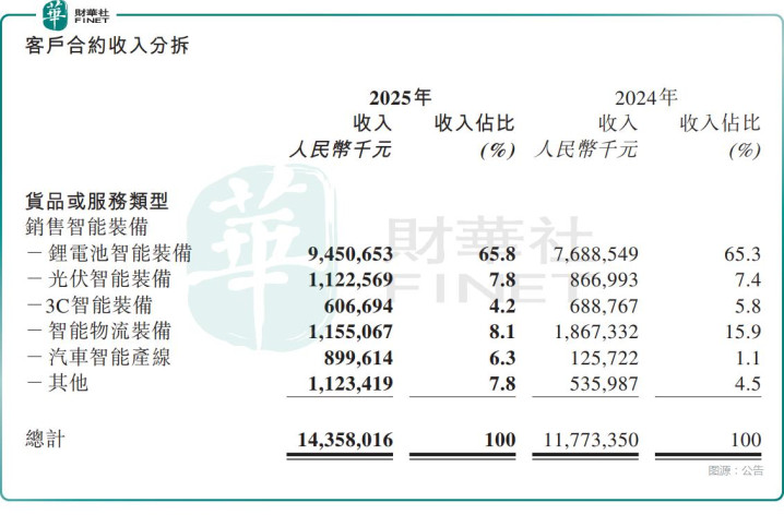 一方面,得益于卑鄙行业强势复苏,锂电、储能、光伏需求全面回暖,头部电板企业扩产节律加速,带动公司中枢装备订单与验收同步放量,锂电板智能装备中枢业务收入同比大增22.9%至94.51亿元,光伏智能装备收入11.23亿元,同比增长29.5%,成为新的增长亮点,此外汽车智能产线收入9亿元,同比大幅增长615.6%,是增速最高的业务。