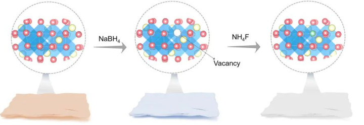 图4.通过引入高电负性的氟离子填充 ZnCo₂O₄ 名义氧空位合成 ZnCo₂O₄₋ₓFₓ 的历程。DOI: 10.1002/ange.202301408