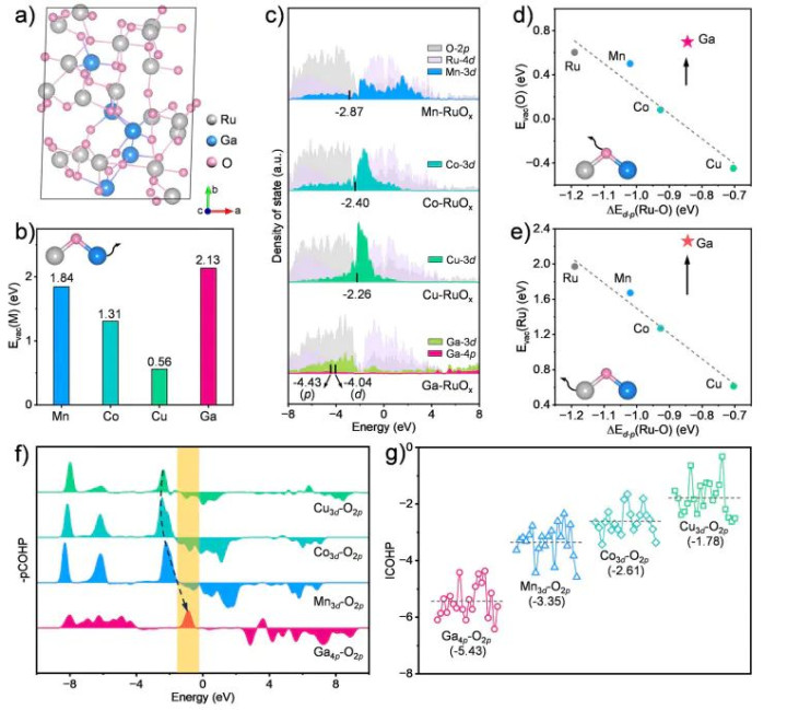 图6.联结杂化轨说念分析,展示 Ga–RuOx的原子构型、不同掺杂金属对RuOx基模子电子结构的影响,以及掺杂金属与晶格氧之间的键合特点。DOI: 10.1002/anie.202505908