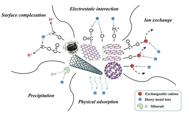图5.重金属在碳基官能团吸附剂上的吸附机制暗示图。DOI: 10.1016/j.cej.2019.02.119