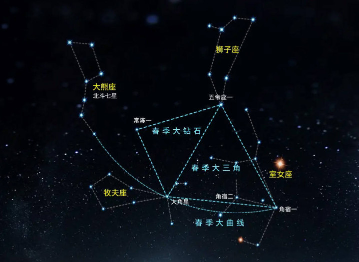 4月的夜晚八九点时,可见北斗七星高悬天空,斗柄指向东方,符号着百花齐放的季节。春季大三角的三个亮星——角宿一、大角星和五帝座一,是天外中的亮眼符号。
