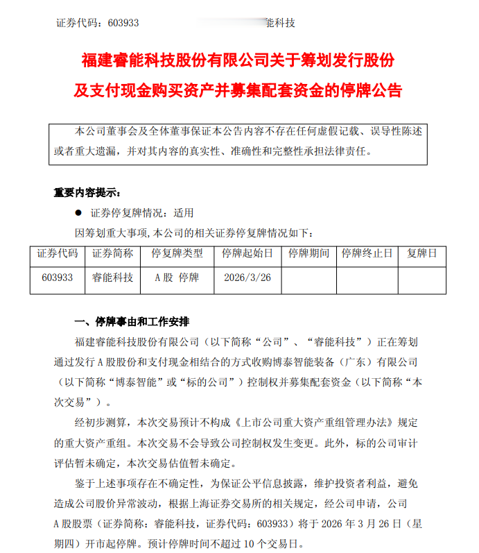 3月25日,睿能科技(603933.SH)公告称,公司正在沟通通过刊行股份及支付现款相筹备的面孔收购博泰智能装备(广东)有限公司不向上75%的股权,九游jiuyou以获取其罢了权,并召募配套资金。本次往复展望不组成紧要钞票重组,不会导致公司罢了权变更。鉴于事项存在省略情趣,为爱戴投资者利益,公司股票自2026年3月26日起停牌,展望停牌不向上10个往将来。