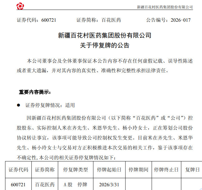 值得一提的是,本次交游是百花医药时隔两个多月后重启放手权变更事宜。2025年12月26日,百花医药公告实控东说念主米在都等三东说念主正在权术股份条约转让,可能导致放手权变更。2026年1月6日,百花医药宣告放手权变更事项拒绝,原因是两边“未就紧要事项达成一请安见”。受该音讯影响,百花医药1月7日复牌后连收两个跌停板。