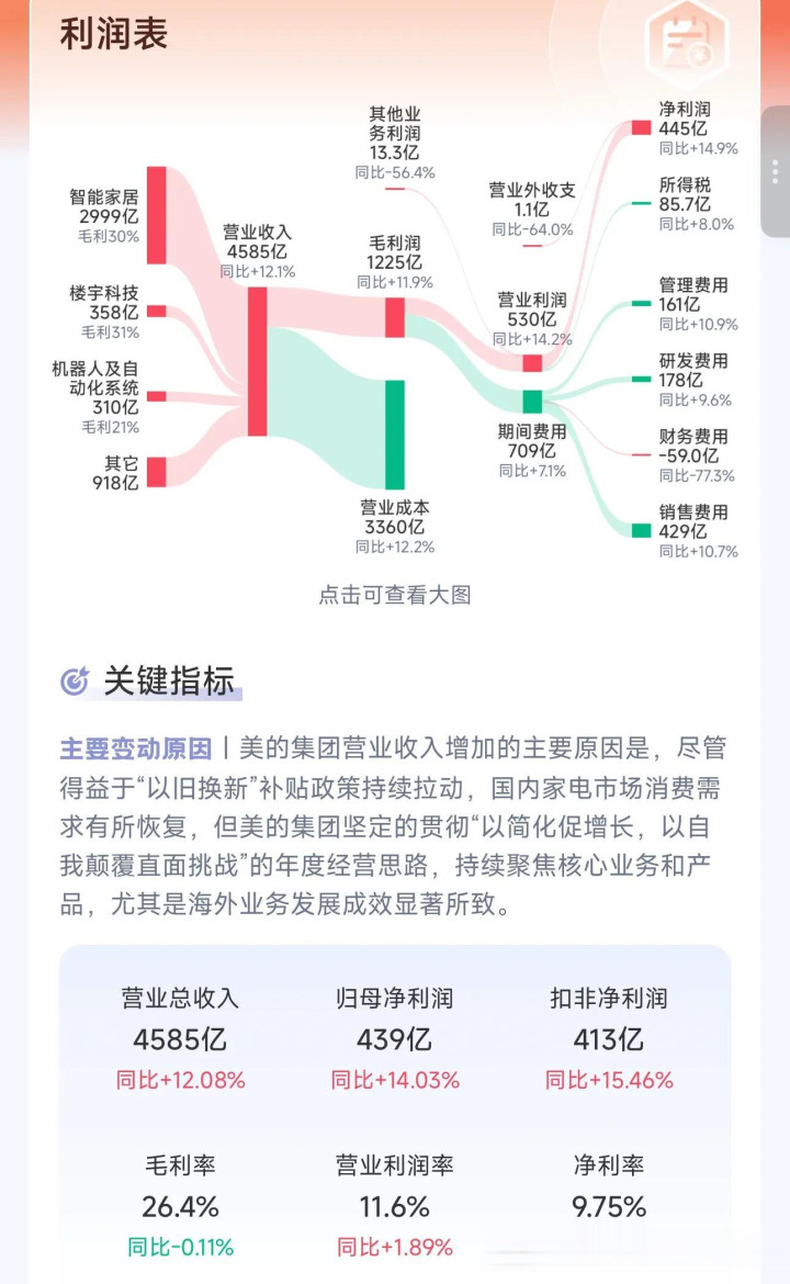 抛开回购的护盘手脚,咱们先看好意思的2025年交出的这份收获单。全年营业收入约4564.52亿元,同比增长12.11%,归母净利润约439.45亿元,同比增长14.03%,扣非归母净利润412.67亿元,同比增长15.46%,基本每股收益5.80元。利润增速高于收入增速,最直不雅地讲明公司的推敲质地在擢升,不是靠鸿沟延迟硬堆营收,利润端还有实确凿在的改善。