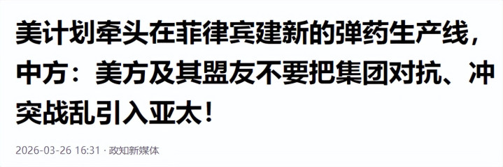 政知新媒体:2026-03-26:好意思打算牵头在菲律宾建新的弹药出产线,中方:好意思方偏激盟友不要把集团起义、冲突战乱引入亚太!