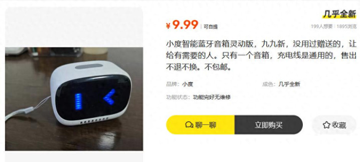 二手鱼有东说念主挂出来一个小度智能蓝牙音箱灵动版,九九新的,平直标价9.9元。仔细看了看描摹,卖家说是别东说念主送的,放着亦然放着,干脆廉价出了。这根由在二手鱼里其实挺常见的,许多全新的礼盒版小度音箱齐是这样流出来的。9.9元的价钱,别说功能浅显音质可以,就算买总结当个桌面摆件齐不醉心啊。