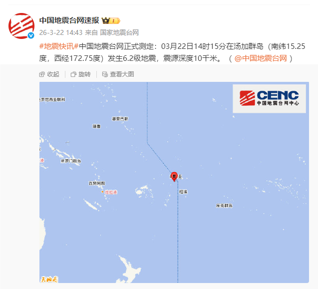 中国地震台网厚爱测定:03月22日14时15分在汤加群岛(南纬15.25度,