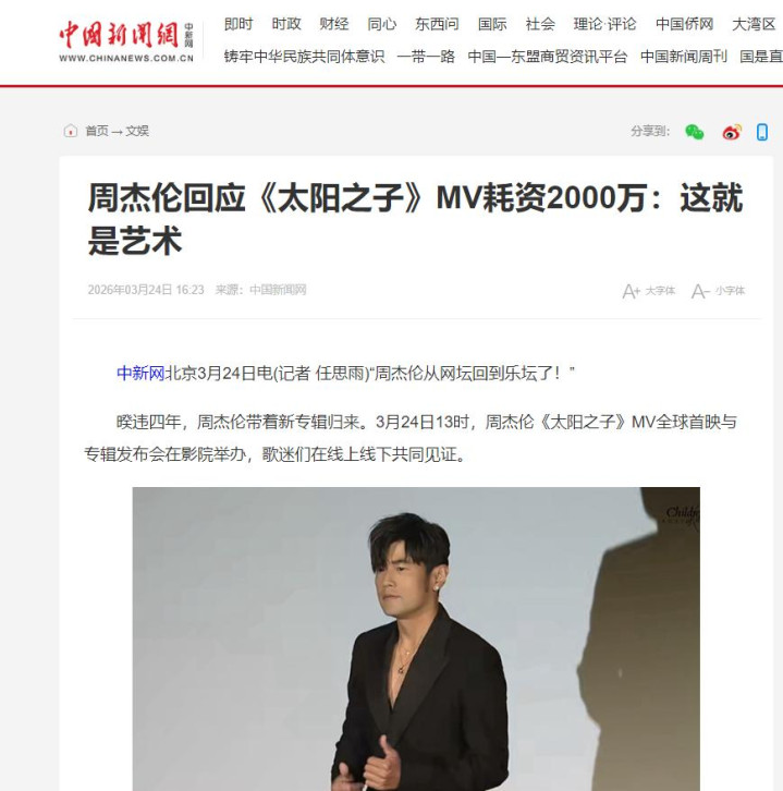 周杰伦回复《太阳之子》MV耗资2000万:这等于艺术——中国新闻网