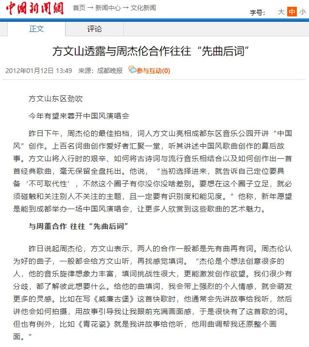 方文山显现与周杰伦配合通常“先曲后词”——中国新闻网