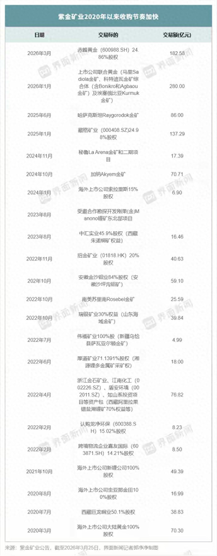 从2020年到2026年3月,紫金矿业的收购作为就没停过,想法遍布各人,金额一次比一次惊东说念主: