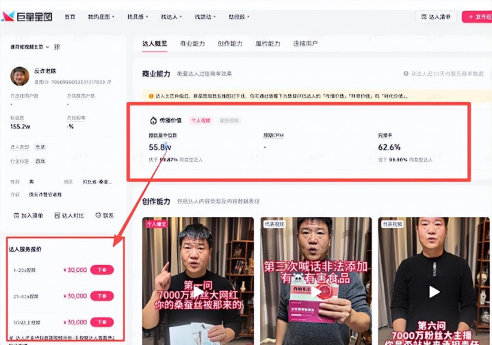 视频播放量中位数能达到55.8万,完播率更是高达62.6%,比许多同类型达东谈主都优秀。