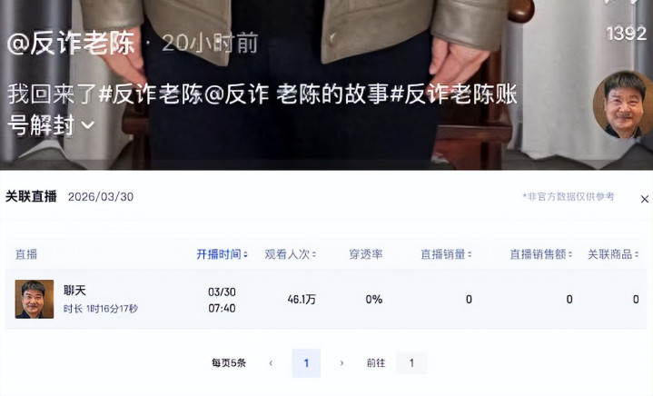 九游jiuyou 反诈老陈解封回来, 首播46万东谈主围不雅, 本东谈主魄力耐东谈主寻味