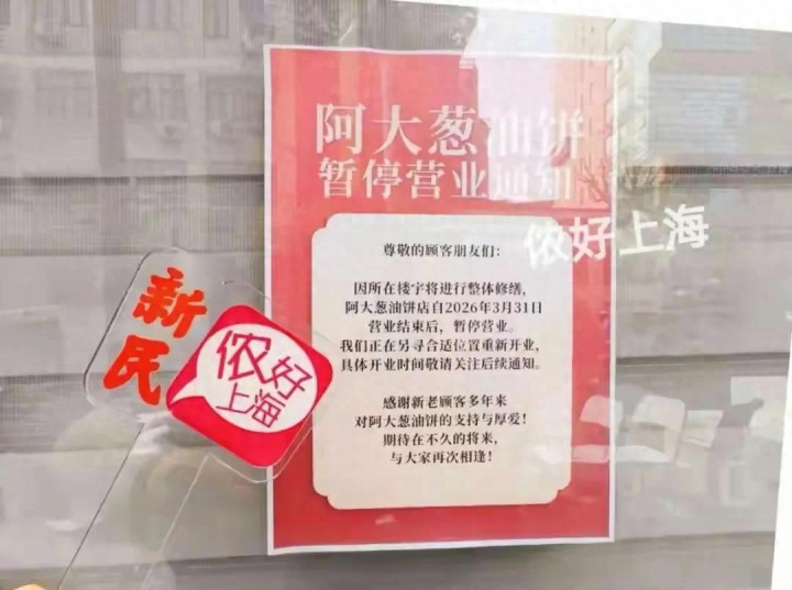 2026年3月31日晚,上海石门二路65号的“阿大葱油饼”店,在雨夜中终明晰终末一天营业。一张红色的“暂停营业奉告”贴在门上,宣告这家承载老上海味觉挂牵的网红店,在重开不及一年后再度停业。平直原因是楼宇举座修缮、条约到期,但背后是技巧传承、老本高企、选址受限、口味争议的多重压力。独家对话阿大(吴根存)之子吴志勇,他明确默示:不会轻言毁灭,将另觅新居,守住父亲的老滋味。