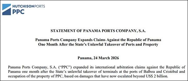 巴拿马口岸公司指出,这一数字源于巴拿马政府的一系列行径,包括不对法接受巴尔博亚港、克里斯托瓦尔港两个货柜船埠、扣押很是及受法律保护的文献,以及⼀系列相关不妥⾏为,对巴拿马口岸公司的打压行径“已捏续逾⼀年,并束缚升级”。