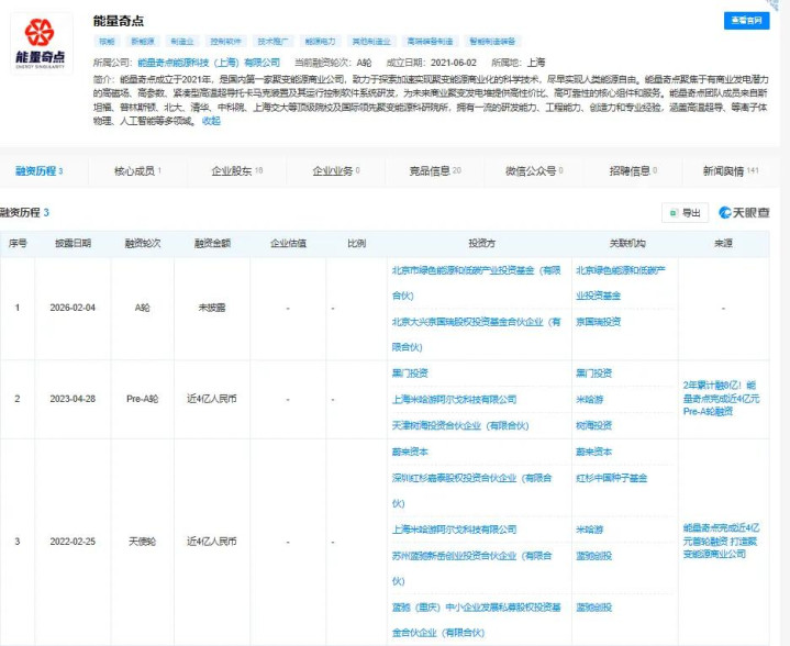 就在2026年2月,能量奇点刚刚完成A轮融资,这一次还勾引了北京国资基金入股,包括北京绿色动力和低碳产业投资基金、京国瑞投资。