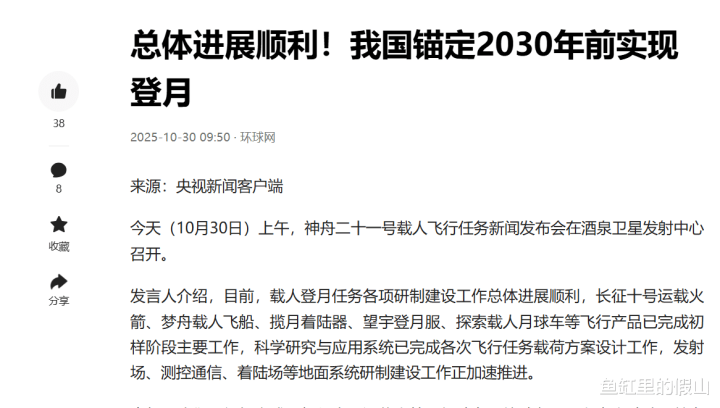 另一边,中国的载东谈主登月工程,则呈现出澈底不同的鼓励节拍。